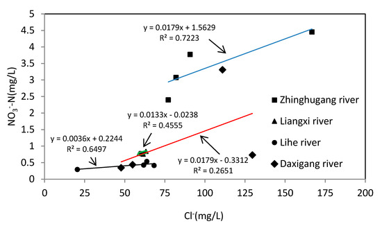 Relationships between Cl− and NO3−-N concentrations in the Zhihugang, Liangxi, Lihe, and Daxigang rivers.
