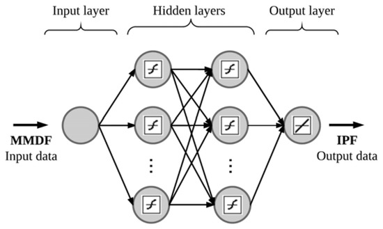 To estimate IPF data, we used the feedforward multilayer perceptron network (MLP), the most popular ANN in hydrology [37]. The MLP network includes an input layer, an output layer, and one or more hidden layers. The first layer receives the input data, the hidden layers process data, and the last layer obtains the output data [38]. Each layer contains one or more neurons connected with all neurons of the next immediate layer through vertically aligned interconnections. The output y of a neuron j is obtained by computing the following Equation (5) [39]: