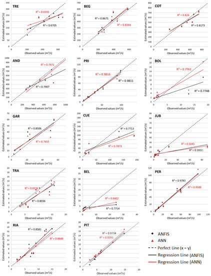 Moreover, according to the plots in Figure 3, where line slope and correlation coefficient between observed and measured values of IPF obtained with ANN and ANFIS techniques are compared, ANFIS seems to be slightly better in most of the gauge stations studied because those results concentrate closer to the identity line (perfect line) and the correlation coefficient is closer to 1. However, the differences between the techniques increase when the RMSE results are analysed, as shown in Table 4.