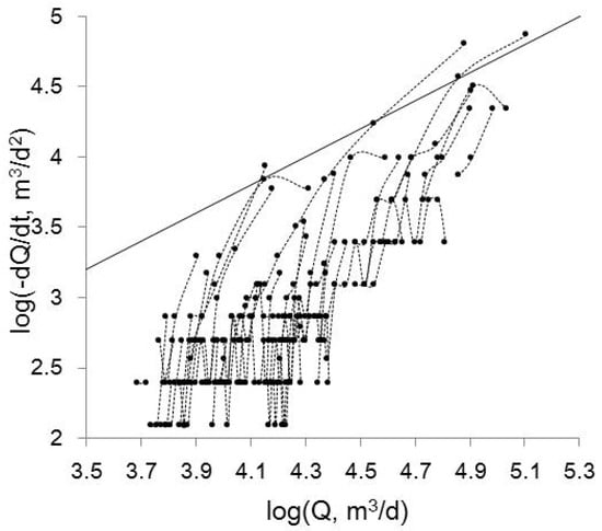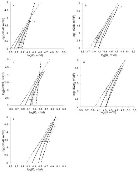 The 51 individual recession curves were separated into several ranges according to the logarithmic values of the minimum discharge at the end of each recession (Qmin). The number of ranges was chosen subjectively to make each range include at least seven recession curves with similar values of Qmin. As a result, five ranges were used, and are shown in Figure 4 and Table 1. The mean discharge of recessions of each range varies between 8054–58,899 m3/d and encompasses a wide range of wetness conditions. Each plot in Figure 4 was indicated by two straight dash lines. The upper envelope was placed with a slope of 3. In keeping with Equation (5), this upper envelope represented the short time recession behavior. The lower envelope was placed visually by ignoring the data points with an inverse U shape. Thus, all of these initial data points were ignored during the following analysis.