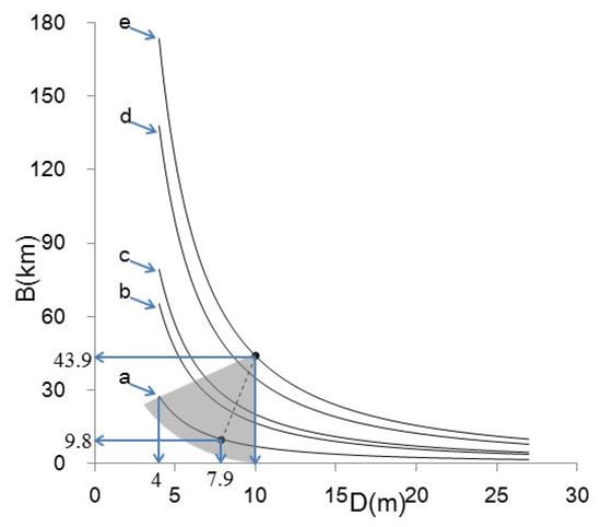 B vs. D curves calculated using Equation (6). The five black curves are related to five ranges, respectively. The gray zone illustrates the possible range of active stream network. The dash line in the gray zone illustrates the estimated ASNL according to the assumptions stated in Section 4.