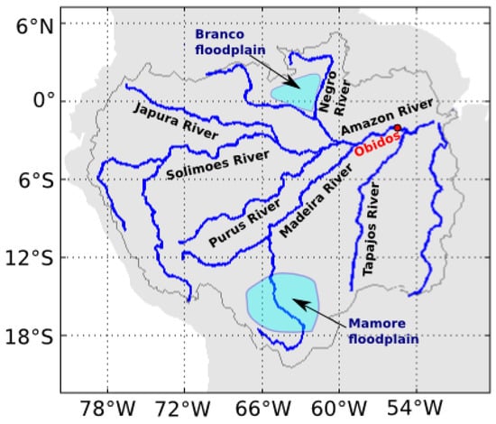 This study focuses on the Amazon Basin, which is the largest tropical basin with an area of approximately 6,000,000 km and contributes up to 15% of the global river discharge to the ocean (approximately 200,000 ms discharge). With a sediment load of three million tons near its mouth [] and drainage area covers about 6,200,000 km, almost 5% of all of the continental masses, the Amazon Basin is one of the most impressive hydrological basins of the world. The Amazon is highly interconnected by floodplain channels, resulting in complex flow patterns. Figure 1 presents the Amazon Basin with the main rivers and floodplains. Covering more than 300,000 km, the Amazon extensive floodplains play a crucial role for global climate and biodiversity, but they are still poorly monitored at a large scale, limiting our understanding of their role in flood hazard, carbon production, sediment transport, nutriment exchange and air-land interactions. Surface water stored in floodplains represents about half of the terrestrial water storage and 15–20% of the water that flowed out of the Amazon floodplains [,,,,]. Because it extends over two hemispheres, the Amazon region is characterized by several rainfall regimes. Rainfall shows opposing phases between the Northern and the Southern Hemisphere with a rainy season in austral winter in the Northern Hemisphere and summer in the Southern Hemisphere. The rainfall shows a gradient from northwest to southeast with decreasing rainfall amount and increasing length in the dry season. For the eastern part of the basin, the rainy season occurs from March–May, and the dry season prevails from September–November. For the northern regions, low rainfall seasonality is observed with wet conditions throughout the year. For more information on the Amazon hydrological regime, see [,,].