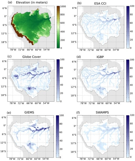 (a) Elevation (in meters) of the Amazon Basin from the SRTM data rescaled in the EASE v2.0 grid; spatial distribution of the water surface from: (b) ESA CCI; (c) IGBP; (d) Globe Cover; (e) average inundation extent from GIEMS from 1993–2007 over the Amazon Basin; and (f) average inundation extent from Surface Water Microwave Product Series (SWAMPS) from 2010–20over the Amazon Basin.
