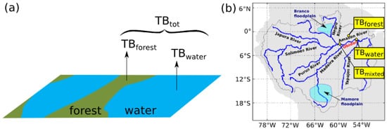 It is well known that the microwave emission is highly impacted by the dielectric constant []. In the present algorithm, we assumed that over the tropical basins, the pixels are only composed of two contributions: the water and the forest, such as represented in Figure 3.