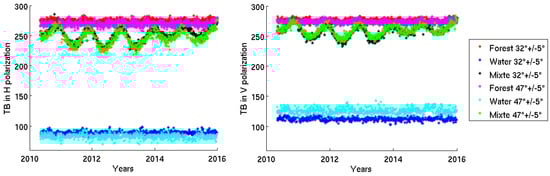 Time series of TB at H polarization (left) and V polarization (right) at two incidence angles (32± 5 and 47± 5): the “water”, “forest” and “mixed” pixels.