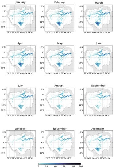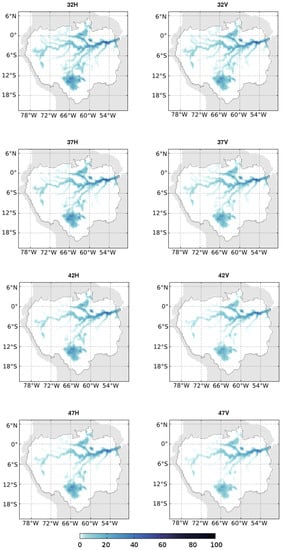 Water surface can be sensed by optical remote sensing methods. These methods typically exploit the absorption of longer wavelengths of light in water, especially the near and shortwave infrared parts of the electromagnetic spectrum [,]. Optical remote sensing provides very accurate mapping of water bodies. For example, [] senses lakes with a spatial resolution of 15 m, whereas [] sensed global water bodies at 30-m resolution using the Landsat data. The majority of the studies using optical remote sensing for water bodies’ detection provided only one snapshot of the hydrology stage. Due to the low revisit time of the optical sensors, few maps of a large area are available, and the minimum and/or the maximum of the flooded area are not always observed. The detection of sudden changes impacting the hydrologic cycle [] is also not sensed with accuracy. These limitations are crucial issues for hydrology application. However, some studies [,] managed to follow the temporal dynamics of the water surface in specific places. The most important limitation of the optical sensors is their inability to penetrate clouds and dense vegetation cover, which is essential during tropical wet seasons over the Amazon Basin.