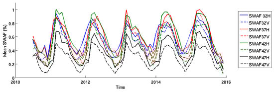 As shown in Figure 4, the values over the “forest”, the “water” and the “mixed” pixels differ slightly following the angles and the polarization. For all of the polarization and the incidence angles, the values of the “water” pixel are the lowest, whereas the values of over the “forest” pixel are highest. The values of over the “mixed” pixel are included between the two contributions. Over the six years, the values of and are very constant with time. This is not the case for the time series of , which shows annual cycles due to the annual inundation of the Amazon River. For the “mixed” pixel, at each date, Equation (2) is computed to obtain the SWAF value. This method is generalized over all of the pixels of the Amazon Basin (the localization of the “mixed” pixel moved, but the water and forest reference pixels are always the same). The data are computed each day with the SMOS ascending overpass and smoothed with a sliding window of 17 days.