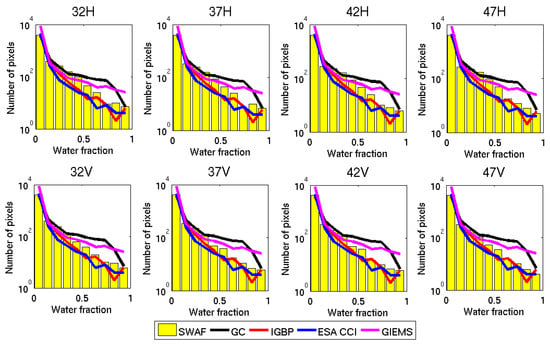 Histogram of water fraction for the IGBP map (red), GlobeCover map (black), the ESA CCI (blue) and SWAF (yellow columns) for eight SMOS TB configurations (32–47 angle bins and H/V configurations).