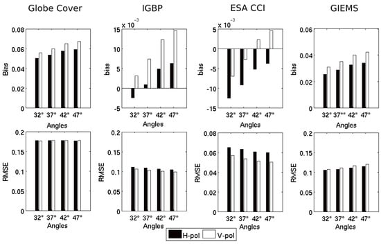 Figure 9 presents the bias (reference static maps, SWAF configurations) and the RMSE between water surface extent for each reference maps used in Figure 8 and the water surface extent for the eight SMOS configurations. For all of the SWAF configurations, lower bias is obtained by comparing the SWAF data with IGBP (mean bias = 0.6%) and ESA CCI (mean bias = −0.4%). Higher bias is obtained by comparing SWAF data with the GlobeCover map (mean bias = 5.9%). Bias between the static maps and the SWAF data is always higher at V-polarization than at H-polarization for all of the static maps. Moreover, the bias values increase with the growth of the incidence angles. A lower RMSE value is obtained by comparing the SWAF data with the ESA CCI map (mean RMSE = 5.8%), and a higher RMSE value is obtained with the GlobeCover map (mean RMSE = 17.8%). Following the static map considered, the behavior of the SWAF data with respect to angles and polarization differs. For IGBP and ESA CCI maps, lower values of RMSE are obtained at V-polarization than at H-polarization, and a slight decrease of the RMSE values is observed with the increase of the incidence angles. The contrary is noticed for the comparison with the GIEMS data. No trend concerning the RMSE behavior is observed for the comparison between the SWAF data and the GlobeCover data.