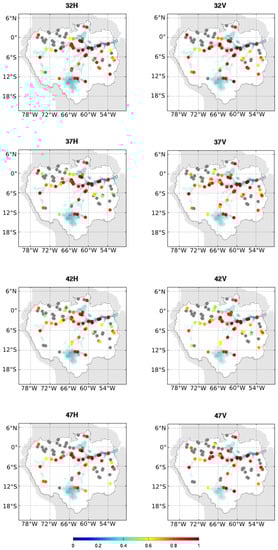 For low topography slopes, the water surface extent can be related to the water height. Other studies [,] had already shown that the seasonal and inter-annual variation patterns of the surface water extent and the water level agree well. In this present study, the water levels measured by the Jason-2 satellite were compared with the SWAF product over 83 virtual stations during the 2010–2012 periods. Results are presented in Figure 10. Only stations with significant results (p-value < 0.01) are represented. The color dot indicates the correlation value for each virtual station. The gray color dots show the virtual station with non-significant results. For all of the SMOS configurations, the correlation value between the water fraction and the water level measured by Jason-2 is very high (r > 0.8) throughout the Amazon River and the major tributaries. The lower correlation values are located over areas where the relation between the water surface’s extent and the water level is not direct. For a given angle, slight differences in terms of correlation values are observed with respect to the polarization choice. The number of not significant stations varies following angles and polarization. At H polarization, the number of no significant stations is equal to 36, 33, 33 and 44 for angles from 32± 5–47± 5, respectively. At V-polarization, the number of no significant stations is slightly lower and equal to: 35, 30, 31 and 44, respectively.