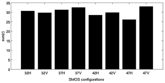 For each SMOS configuration, the sum of the correlation value (r) obtained in Figure 8. Only significant stations for all of the SMOS configuration are used for the computation.
