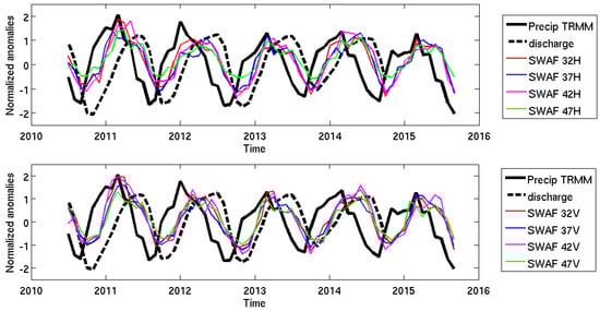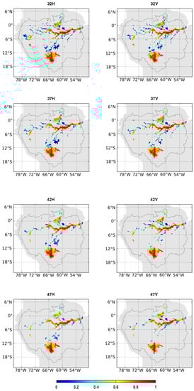 SMOS has a Sun-synchronous orbit at a 757-km altitude with a 06:00 LST ascending Equator crossing time and an 18:00 LST descending Equator crossing time. The globe is fully imaged twice every three days. The main innovative feature of SMOS is the capability for multi-incidence-angle observations at full polarization across a 900-km swath. In this study, the SMOS Level (L) 3 TB (RE04v300) products [] produced by the Centre Aval de Traitement des Données SMOS (CATDS) are used. These data are projected on the Equal-Area Scalable Earth (EASE) Grid 2 [] with a spatial resolution of 25 km × 25 km. The main differences between the SMOS L3 TB and the other lower levels of data are: (i) the L3 TB products are expressed at the top of the atmosphere over the terrestrial reference frame (H and V); and (ii) they are bin averaged every 5 from 2.5–62.5. In the present study, SMOS L3 TB were used from 2010–2015 over the Amazon Basin. Angles of 32 ± 5, 37 ± 5, 42 ± 5 and 47 ± 5 in both H and V polarization were considered to retrieve the water fraction over the tropical basin. The SMOS data were downloaded from the CATDS servers (www.catds.fr).