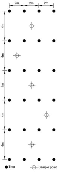 Based on stand survey, three sample trees were selected near sample plots. Assuming the tree trunk as the center, tree roots were almost symmetrically distributed around the tree trunk [46,47]. We idealized tree roots extending as far as 1/2 of distance between trees. Thus, roots that were more than 1/2 of distance between trees were treated as roots of adjacent trees. A 1/4 sample circle method was applied to take samples. In order to measure root biomass accurately, three sample points at the same distance were set at the sample circles whose radiuses were 0.5 m and 1 m (1/2 of distance between trees), respectively, from each sample tree trunk (Figure 2). Root distribution was studied by hierarchical mining methods with a self-made root drill (Root Soil Drill Sampler, CN101482015, 15 July 2009). At each sample point, we excavated and collected tree roots hierarchically in the vertical soil profile, which was divided into five soil layers (0–20 cm, 20–40 cm, 40–60 cm, 60–80 cm, 80–100 cm). After crushing and sieving soil, picking roots from the soil, and cleaning root surfaces, the root diameter d was measured with a vernier caliper. According to standards in a previous studies [48], roots were classified into two groups: coarse roots (d ≥ 2 mm) and fine roots (0 < d < 2 mm). All of the roots were dried at 75 °C in an oven, and weighed, respectively. We set 18 sample points around three sample trees (each sample tree had six sample points) in August 2015. The root biomass of each soil layer was the average of root biomass of all the sample points at the same layer.