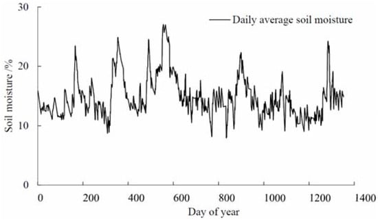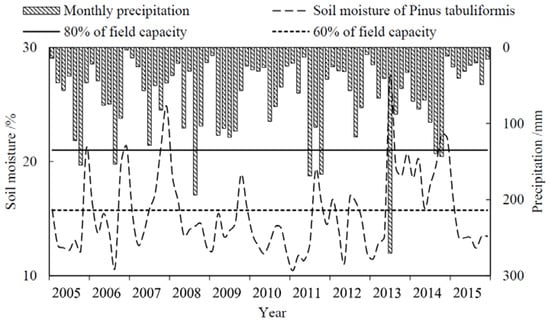 A sample point was set in the center of each sample plot. Five sample points were set in total (Figure 1). Soil moisture of each sample point was monitored with an Enviro-SMART Soil Moisture Profile System (Sentek Sensor Technologies, Stepney, SA, Australia). Soil moisture of the 0–200 cm layer, in 20 cm intervals of the soil profile, was monitored. Determined gravimetrically in each layer, soil moisture was measured every 30 min during the growing seasons of 2005–2015. Real-time monitoring of soil moisture data was maintained with a CR200X Data Logger (Campbell Scientific Incorporation, Logan, UT, USA). The mean soil moisture of 10 layers of five sample points in a day was calculated and used as the daily soil moisture of the experimental forestland. Soil moisture content on the 10th, 20th, and 30th days of each month were extracted and produced a new dataset in which soil moisture was monitored every 10 days. Soil moisture content on the 15th day of each month was selected and formed a new dataset in which soil moisture was monitored every 15 days.