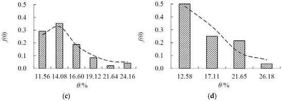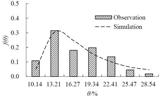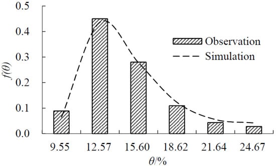 By changing parameters, including soil type, rainfall frequency, rainfall depth, evapotranspiration, and so on, Laio [20] acquired 12 kinds of PDF representing 12 environmental conditions of different soil depths and climate types. Among these environmental conditions, the PDF, under the condition that loam soil with Zr = 90 cm, α = 1.5 cm, λ = 0.2, and Emax = 0.45 cm/d, complied with the curve of Pinus tabulaeformis forestland on the Loess Plateau in this study. This was because the climate and vegetation conditions on the Loess Plateau were similar to the conditions in Laio’s study.