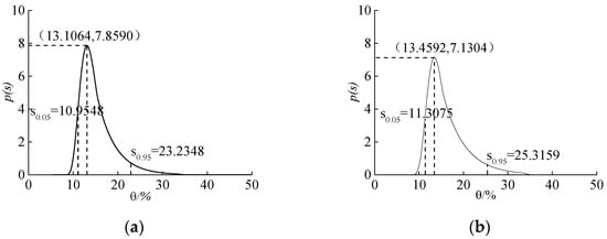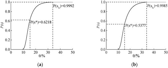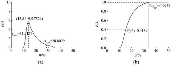 E(θ) is the mean value of θ, which represents the average level of θ during the study period. σ(θ) is the degree of deviation from E(θ), which shows the fluctuation range of θ during the study period. p(s) reflects the intensity at a given point that can be derived from the Chapman-Kolmogorov forward equation for the process under mathematical analysis [37,38,39]. θ is the most dense in the vicinity of x0 which corresponds to the peak of p(s). The area surrounded by p(s) and a specified range is the probability of θ in that range. P(s), which is the integral of p(s), describes the probability distribution of θ, representing the probability in the range of (−∞, x) when soil moisture is x.