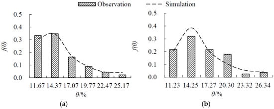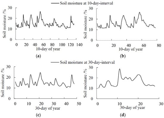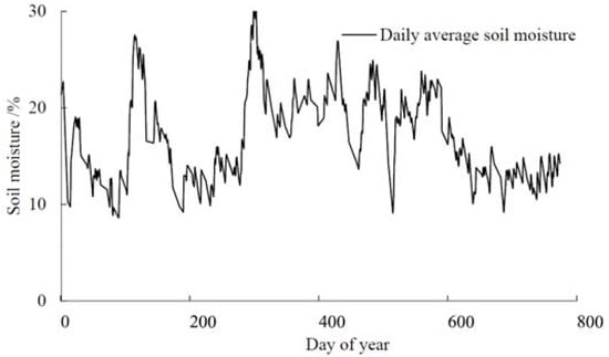 The trend of observed frequency and simulated probability of soil moisture at different sampling intervals was almost the same except in one group in the validation period at each sample interval (group center value was 25.47% for daily soil moisture, 20.30% for 10-day sampling interval soil moisture and 21.65% for 30-day sampling interval soil moisture). Frequencies of observed soil moisture in these groups were higher than probabilities of simulated results. Generally, soil moisture probability is subject to normal distribution, and the probability distribution curve only has one peak. According to Figure 3, a lot of precipitation concentrated in growing seasons of 2013–2014, leading to higher soil moisture values in 2013–2014. It made the observed soil moisture frequency higher than normal conditions, especially in high-level soil moisture groups. Thus, the relatively high frequencies of observed soil moisture in some groups in the validation period were only an occasional fluctuation caused by more precipitation.