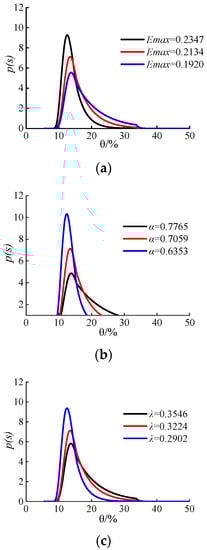 - If the change of the p(s) peak value was more than 10% of the original results before and after parameter adjustments, these parameters were classified as strongly-sensitive parameters. Strongly-sensitive parameters included Emax, α, and λ. Adjusting any one of the three parameters had a significant effect on p(s). Parameter adjustments mainly influenced the 90% confidence interval of p(s). With the increase of Emax, the peak value of p(s) increased, while the peak position of p(s) slightly decreased and the range of the 90% confidence interval decreased (Figure 14a), suggesting that with the increase of evapotranspiration, soil moisture content decreased and the probability concentrated in the low level of soil moisture content increased. With the increase of α, the peak value of p(s) decreased rapidly, while the peak position of p(s) increased slightly and the range of the 90% confidence interval increased (Figure 14b). With the increase of λ, the peak value of p(s) decreased, while the peak position of p(s) increased slightly and the range of the 90% confidence interval increased (Figure 14c). The change of p(s) after the adjustment of α and λ indicated that with the increase of rainfall depth and rainfall frequency, soil moisture content increased and the probability concentrated at a high level of soil moisture content increased.