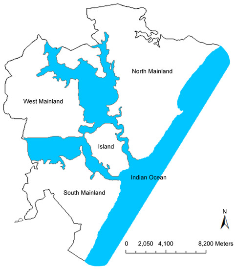 Mombasa City is the second largest city in Kenya with an estimated 1.1 million inhabitants and a land area of 229.7 km2. The city is located in the southern part of Kenya and is divided into four main areas: Island, South Mainland, West Mainland, and North Mainland (Figure 1).