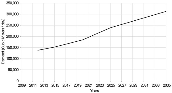 Assuming the population will continue to grow at the average rate of 3.2% experienced between 1999 and 2009 [33], the population is expected to rise to 2.2 million people by 2035, leading to an increased water demand from 150,000 m3/day to 320,000 m3/day (Figure 2). The existing water supply to the city is 102,000 m3/day from Mzima springs, Tiwi boreholes, Marere Springs, and the Baricho Wellfield managed by the Coast Water Services Board (CWSB). Considering system losses of around 47%, the current demand coverage is low [34,35].