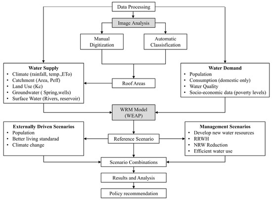 This study mostly addressed the first part of RRWH supply systems at a larger scale and from a more technical perspective. Conveyance and storage systems have not been investigated in detail, and for the practical implementation of RRWH, socio-economic aspects and water quality issues should be considered as well. Additional studies are recommended on building conditions, roof rainwater quality, tank optimization/design, costs and fundraising, awareness creation, and sensitization of the city residents regarding RRWH. Another interesting area that could be investigated in the future is hydrological aspects, such as the benefit of RRWH for flood risk reduction and the effect of RRWH on groundwater recharge.