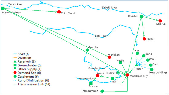 - Demand site: Even though six different demand sites have been shown in the model (Mombasa City, Malindi Town, Kilifi Town, Kwale Town, Mariakani Town, and Voi Town), the study is focused only on Mombasa City and the rest are used to provide a complete picture of the sharing of water resources in the Coastal region.