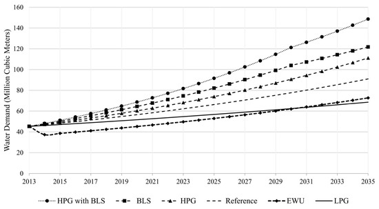 The projected water demand up to the year 2035 for Mombasa City under the different scenarios, namely the reference scenario, better living standards (BLS), high population growth (HPG), low population growth (LPG), and efficient water use (EWU), are shown in Figure 7.