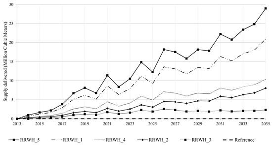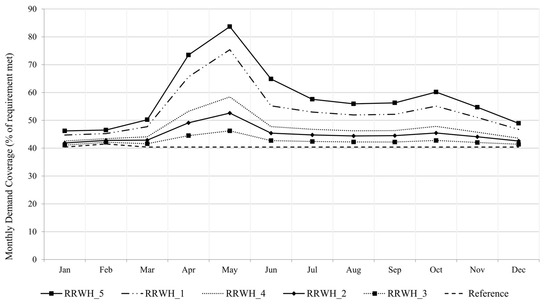 The average monthly demand coverage using the existing supply and RRWH as the only additional strategy is shown in Figure 9. For the reference scenario where no intervention was made to the existing system, the average monthly demand coverage for the whole 2014–2035 period is around 40%. The results clearly show that implementing RRWH improves the water supply situation. Based on the bimodal rainfall pattern in Mombasa City, higher demand coverage is achieved within the rainy months every year. In the month of May, which records the highest rainfall, the average monthly demand coverage increases to 46%, 53%, 58%, 75%, and 84% for RRWH_3, RRWH_2, RRWH_4, RRWH_1, and RRWH_5, respectively.