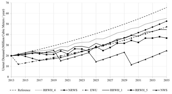 Apart from the RRWH strategies, the other possible management scenarios considered were the development and expansion of new water sources (NWS), efficient water use (EWU), and reduction of non-revenue water (NRWS). In terms of the water supply delivered for the whole period from 2013 to 2035, the responses of the system are presented in Table 11. The NWS scenario, which involves the expansion of existing water sources and the development of new ones, provides the best strategy, which increases the supply by 470 MCM throughout the whole study timeframe. The other strategies result in increases of the supply ranging between 34 MCM to 295 MCM over the same period. The UWE scenario does not increase the supply but reduces the demand, hence its effect can only be seen under demand coverage or unmet demand. Figure 10 indicates that no single strategy will completely solve the water scarcity in the city. Thus, a combination of different strategies is recommended.