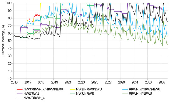 For the combined scenarios, only the most feasible RRWH_4 is used, where only selected existing buildings and all new buildings implement RRWH. The results (Figure 11) show that before the year 2017, none of the combined strategies will meet the demand. Subsequently, only two scenario combinations, namely NWS/NRWS/EWU and NWS/RRWH_4/NRWS/EWU cover the demand fully from 2017 to the end of the simulation period. Consequently, meeting the demand before 2017 is not achievable by any of the investigated management strategies.