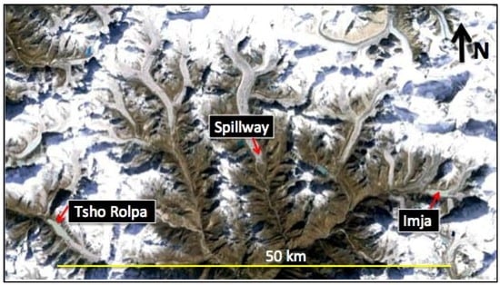 The Tsho Rolpa on northwest-flowing Trakarding glacier (Rowaling valley) and Tsho Imja on the west-flowing Imja-Lhotse Shar glacier (Khumbu valley) are two examples of moraine-dammed supraglacial lakes that have grown considerably in area and volume from 1950 to the present-day [,,,,]. While there appears to be no immediate danger of lake drainage at Imja, continued monitoring is crucial to ensure the terminal ice dam, currently 500 m across, does not narrow and cause a catastrophic flood []. Field efforts in 2016 by the Nepalese Army have already lowered the level of the lake by 3 m in order to preemptively mitigate some of the hazard. The Tsho Rolpa differs in that its terminal ice dam already is much narrower and steeper []. In the event of ice collapse at the calving front, seiche waves could overtop the moraine and promote dam failure. In the late 1990s, a dam and spillway were constructed to lower the lake level and reduce the risk of a catastrophic drainage downstream []. Both lakes have large fetches of multiple kilometers and active calving fronts. Other than partially-ice-cored moraines at their termini, rocky (possibly ice-cored) lateral moraines bound them.