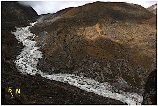 - Hambrey, M.J.; Quincey, D.J.; Glasser, N.F.; Reynolds, J.M.; Richardson, S.D.; Clemmens, S. Sedimentological, geomorphological and dynamic context of debris mantled glaciers, Mount Everest region, Nepal. Quat. Sci. Rev. 2008, 27, 2361–2389. [Google Scholar] [CrossRef]