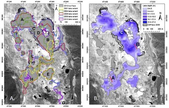Since 2010, the development of a new connection between Spillway Lake and a stable pond called ‘Blue Lake’ (Figure 3 (feature labeled E)) may reroute water towards the eastern moraine [], allowing for more rapid lake expansion, as well as a narrowing of the moraine dam. In 2009, an average lake depth of 10 m was found, with a 26-m maximum depth in the north and a stable region in the south (Figure 3 (feature labeled H)), and a mean depth of 14 m []. Spillway mean depth is shallower by an order of magnitude when comparing with the Tsho Rolpa and Imja supraglacial lakes [,].