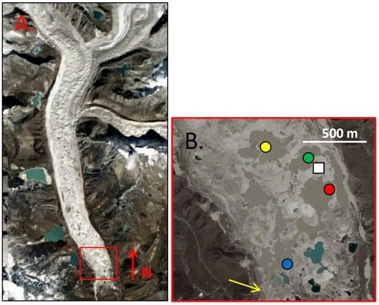 2016 GeoEye high-resolution image of Ngozumpa glacier (A) with Spillway Lake close-up (B), showing temperature buoy locations for this study in the sub-basins (yellow: northwest; green: northeast; red: main; blue: southwest), weather station (white square) and glacier outlet channel (yellow arrow).