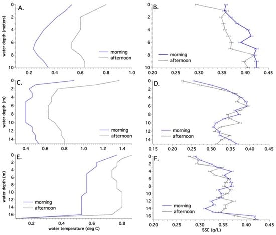Temperatures and turbidity values (converted to suspended sediment concentration (SSC), as seen in Figure S1) were measured in the vicinity of the buoys for the sub-basins in the mornings and afternoons during the first week of June 2014. Figure 5A,C,E shows the temperature variations with depth for the NW, NE and MB sub-basins, respectively, while Figure 5B,D,F shows the suspended sediment concentration variations. The lines represent morning and afternoon averages for the week.