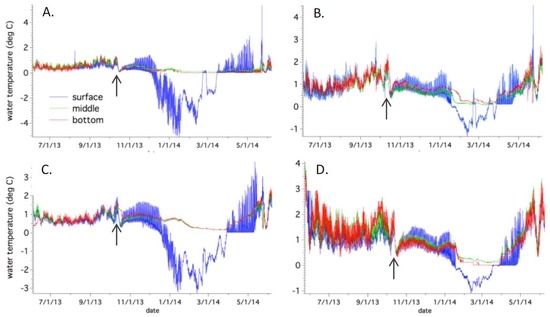 Annual temperatures at the surface (in blue), middle (in green), and bottom (in red) for each sub-basin from 01 June 2013 to 01 June 2014. (A) NW buoy; (B) NE buoy; (C) MB (Main basin) buoy; and (D) SW buoy. The arrows in each show the arrival of Cyclone Phailin (October 2013).