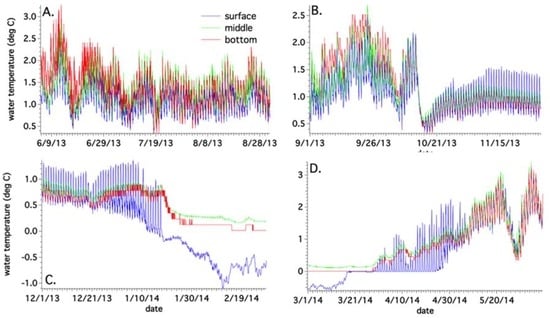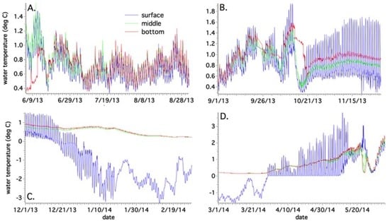 Close-ups of seasonal temperature variations can be seen in Figure 7 and Figure 8 (Figures S4 and S5 for NW sub-basin and NE sub-basin, respectively), showing the deepest (MB) and shallowest (SW) buoy locations. During the summer, bottom temperatures at the MB site reach a maximum of 1.2 °C, while averaging 0.7 °C. Comparatively, SW summer bottom temperatures reach a maximum of 3.26 °C, averaging 1.45 °C.
