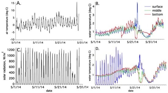Air temperatures (A) and solar radiation (C) during May 2014. Temperatures do not reach their peak until later in the month. Solar radiation remains high (>1000 W/m2) during the month, but the 26 May snowstorm drops this to <400 W/m2. Zoom-ins of the NE buoy location (B) and the Main buoy location (D) for May 2014 show anomalous bottom water temperatures on 23 May.