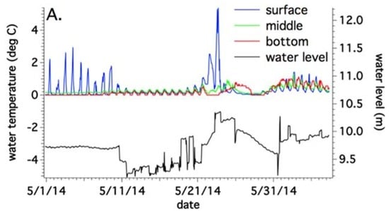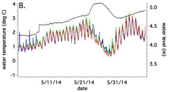 Another close-up of May 2014 is shown in Figure 10, in which water temperature and pressure transducer data provide more insight to the 23 May anomaly from the other sub-basins. The NW buoy location shows a more chaotic gain in water level during the spring thaw (Figure 10A). Its proximity to debris-covered ice walls could cause occasional disruptions, yet the overall increasing water level pattern continues from 11 May to 23 May. The same gradual rise is seen in the SW buoy location (Figure 10B). A gain of 0.5 m occurs during the time of the anomaly, though it starts in the NW location at 7 a.m. on 23 May. The gain in SW is more gradual, peaking out a day later. A snowstorm keeps the level high through 26 May, and by the end of the month, both sub-basins return to their pre-gain levels.