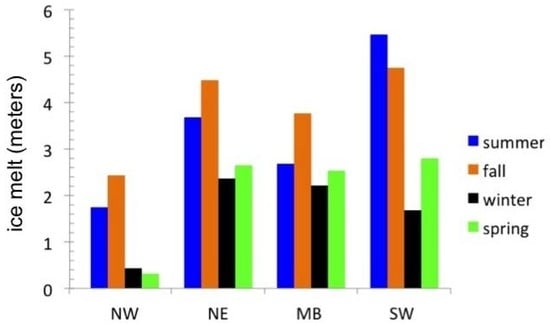 Figure 11 compares the sub-basins across the seasons, using only one debris thickness (1 cm) as an example. In NW, NE and MB, ice melt rates are highest during the fall, while for SW, summer rates are higher. High rates in the SW basin can be attributed to its shallower depth and significant distance away from actively calving and/or melting ice walls. The decline of surface melting in the fall in the other basins aids in heat storage. Winter and spring rates are low in the NW buoy site, given its very cold temperatures throughout. The rates are comparable for the NE and MB. With the addition of an ice cover, heat can be dedicated towards bottom melting. This has been documented by [] for small supraglacial ponds on the Khumbu glacier.