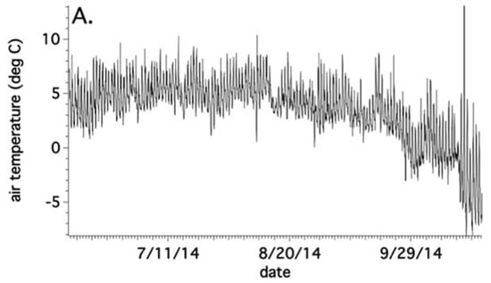 A close-up of May 2014 is seen in Figure 9 for the NE and Main sub-basin buoy locations, along with meteorological data, in order to understand the event that occurred before the 26 May snowstorm (Figure 9C) that led to cold temperatures and mixing throughout the water columns (Figure 9B,D). No anomalous air temperatures were recorded for 23 May (Figure 9A), although NE reached a peak surface temperature of 4.5 °C, and MB saw a comparatively high 3.2 °C. In the former case, this would lead to stratification of the water column, given lower buoyancy of the warm surface water. In the latter case, bottom temperatures of 0.2 °C would be less dense and would want to rise to replace the surface water. The snowstorm interferes with the mixing ‘signal’ in the water column, following this event. However, on 23 May, the middle temperature in the MB sub-basin tracks with the bottom temperature of 0.2 °C, indicating that this may be an englacial/subglacial emergence of meltwater (Figure 9D). The NE sub-basin records a similar 0.2 °C bottom temperature drop, though the middle does not track as clearly as in the MB location. A similar event in NE a week prior shows bottom temperatures again dropping to low values, although not as low as the 23 May event, while the surface remains unchanged. The distance between these sub-basins is approximately 200 m.