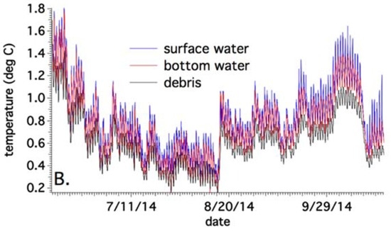 Air temperatures (A) and surface (blue), bottom (red) water temperatures and debris (black) temperatures (B) were measured in the Main sub-basin from June–October 2014.