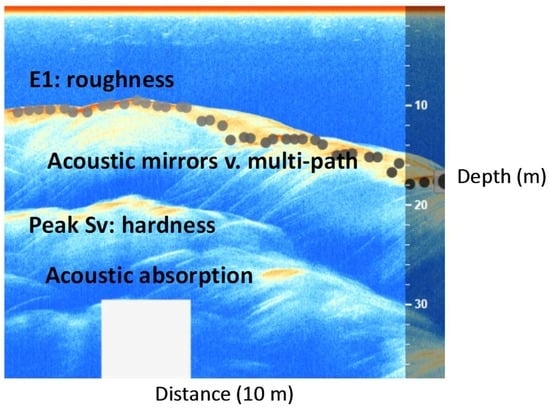 To determine bottom hardness, the secondary echo region (E2) can be used. This is a measure of the acoustic absorption or impedance of the bottom. Mud and materials with high water content will absorb a large proportion of the transmitted acoustic energy, reducing the echo amplitude, whereas hard substrates will reflect a greater proportion of the transmitted energy, resulting in high amplitude secondary echoes [,]. In cases where E2 returns are not picked up, due to insufficient depth, peak Sv is used instead. This is calculated from the primary echo and defined as the observed maximum volumetric backscatter (Sv) of all of the acoustic samples within the layer between the sounder detected bottom and the bottom of the E1 layer.