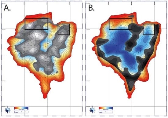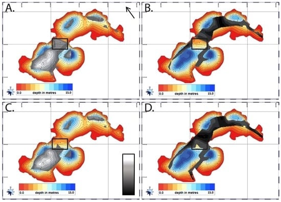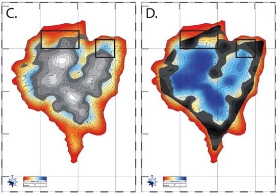 Figure 14 and Figure 15 show NE and Main sub-basin E1 and peak Sv maps (Figures S8 and S9 for NW and SW sub-basins). In both cases, (A) reveals smooth substrate from the E1 return, while (C) shows soft substrate from the calculated peak Sv. (B) and (D) show rocky (E1) and hard (peak Sv), respectively. Rocky and hard returns in Figure 14B,D are seen in the eastern sector and correlate well with recent shallowing.