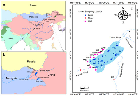 (a) Study area in country-scale map, with a green star indicating the location of the International Atomic Energy Agency’s Global Network of Isotopes in Precipitation (Qiqihar station); (b) Hulun Lake basin showing two major rivers (Kelulun River and Wuerxun River) that flow into Hulun Lake, and the Xinkai River, which intermittently provides an outlet for Hulun Lake to the Hailaer River; (c) River, domestic water well, and lake sampling site locations. The arrow near Hailaer River shows the flow direction of Hailaer River. The Xinkai River is an intermittent connection between Hulun Lake and the Hailaer River.