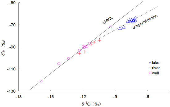 Dual isotope diagram of δ18O and δ2H in lake, river, and domestic water well samples. The local meteoric water line (LMWL) is shown for the International Atomic Energy Agency’s Global Network of Isotopes in Precipitation, Qiqihar station [42].