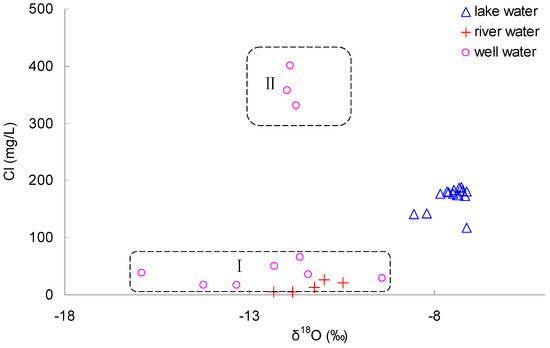 A cross plot of δ18O values and chloride concentrations in lakes, rivers and wells. Zone I and Zone II are divided based on the significant difference in chloride concentrations in western and southern wells, respectively.