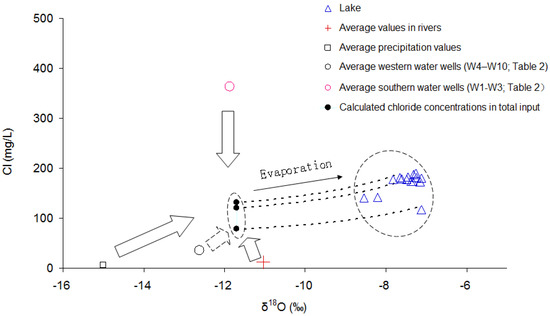 (2) Although the relatively high δ18O and δ2H values for the present-day lake were consistent with significant evaporation of water from combined total input water from rivers, precipitation, and groundwater, the chloride concentrations were higher than could be accounted for by evaporation alone.