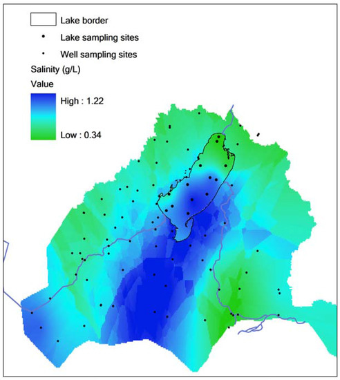 The spatial distribution of salinity (g/L) in domestic water well samples around Hulun Lake. Unpublished data (collected in 2008), College of Water Resources and Civil Engineering, Inner Mongolia Agricultural University.