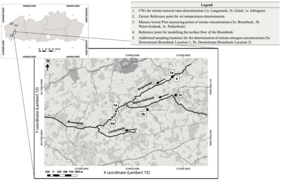 The Broenbeek is an unnavigable watercourse, part of the IJzer basin, with a catchment area of approximately 3 km2. It is characterized as a polder watercourse, meaning that it generally has a low flow and that human intervention has modified its natural course. Moreover, the Broenbeek flowing through Langemark–Poelkapelle receives the impact of different agricultural activities, such as the cultivation of grains, potatoes, ornamental plants, as well as intensive pig and cattle farming [18]. Therefore, it was considered as an appropriate stream where ICWs could be implemented. Figure 1 shows the complete course of the Broenbeek to which two other streams, the Watervlietbeek and the Landerbeek, join. Additionally, it plots the Flanders region with all the measuring points from which data were retrieved for this study. The local environmental conditions and the water quality data of the Broenbeek were acquired from the Flanders Environment Agency (VMM) portal site, or via contact with water resource managers working at this entity. Points 2, 3a, and 4 were used for retrieving, processing, and analysing data. Points 3b and 3c measuring locations of the VMM, were considered as the reference of nitrate concentrations impacting the Broenbeek (see Figure 1 points 2, 3a, 3b, 3c, and 4). In addition, to compare the reported values by the VMM and to determine nitrate-nitrogen concentrations downstream from point 3a, two sampling locations receiving the discharged effluent from a CW located in Langemark were considered (see Figure 1 points 5a and 5b).